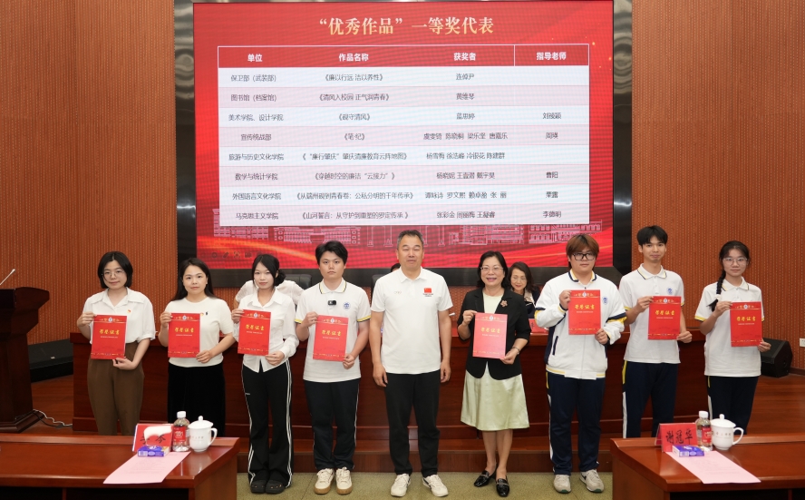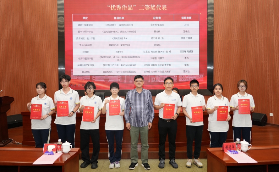 7篇作品在校园征文赛获奖,分别是:潘敏仪老师指导的《清风育德守初心,廉洁笃行担使命》(作者:林志航)荣获二等奖;《清风拂校园,廉心润年华》(作者:邓丽婷)荣获三等奖;汤瑞雪老师指导的《廉洁修身,清风致远:一场始于校园的自我抵达》(作者:郑洋)、《以廉修身,以洁修德:校园廉洁文化建设的深耕与致远》(作者:周艳娜);阳老师指导的《风过岭南,吹起校园廉色》(作者:何泓杉)荣获三等奖,《清廉之风立于校,修身之道现于表》(作者:黄翠婷);孙钊老师指导的《无人看守的展厅》(作者:吴冰仪)荣获三等奖。