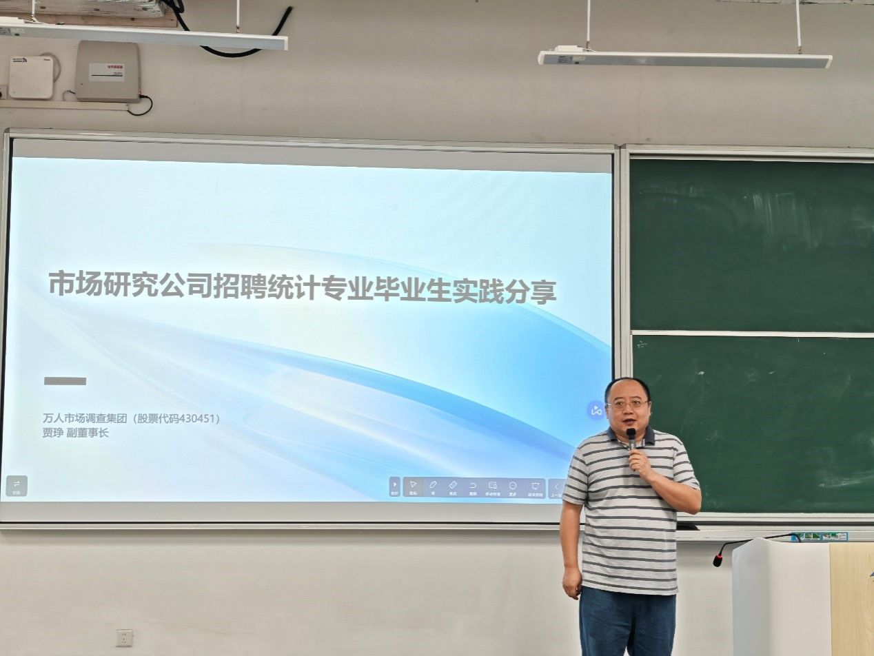 11月12日,广州跃数研网络科技有限公司副总经理吴长江、万人市场调查集团副董事长贾琤两位行业专家应邀莅临公司,开展了以市场研究与人才培养为主题的专题讲座。讲座由公司统计系主任王秋平主持,2025级应用统计专业研究生以及2023级应用统计学、统计学和2024级应用统计学专业本科生共同参与学习。