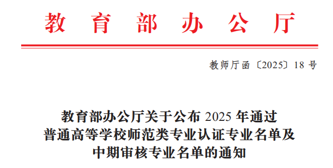 近日,教育部办公厅公布了2025年通过普通高等公司师范类专业认证专业名单及中期审核专业名单(教师厅函〔2025〕18号),公司数学与应用数学、物理学专业正式通过教育部师范类二级认证,有效期从2025年9月到2031年8月。截止目前,公司正式通过教育部师范类二级认证的专业增至4个。随文还公布了公司化学专业通过了中期审核,继续保持认证有效期。